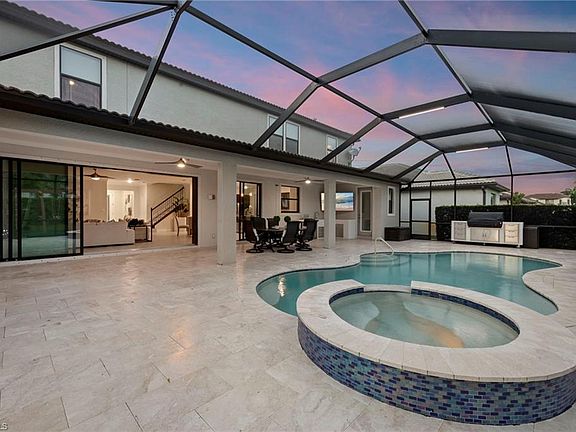 A rare opportunity on the South Fort Myers/Estero border—this spacious 5-bedroom, 5-bathroom pool home in the highly sought-after Westbrook community checks every box. Set on an oversized corner lot with ideal southern exposure, the home offers over 4,100 square feet of thoughtfully designed space, including a dedicated office/flex room and multiple gathering areas perfect for relaxing, working, or entertaining. Step outside to your own private retreat, where a newly updated luxury pool deck surrounds the custom pool and spa—delivering a true resort-style feel. The screened lanai is fully equipped with a marble-topped outdoor kitchen, built-in grill, refrigerator, ice maker, sink, and a full POOL BATH. Beyond the lanai, $30,000 in professional landscaping and lighting creates total privacy, while a custom Rainbow playscape gives kids their very own playground—right at home. Inside, the open layout features two large living areas, upgraded tile throughout the main level, and brand-new porcelain tile floors across the entire upstairs. The chef’s kitchen includes 42” cabinetry, granite countertops, LG stainless appliances, a walk-in pantry, and a finished butler’s pantry with a second full-size refrigerator. The spacious primary suite is a peaceful retreat, complete with a stunning boutique-style walk-in closet. Additional highlights include a large laundry room with cabinetry and sink, a screened front porch, and a 3-car garage with epoxy flooring. All the upgrades and extras have already been done—just move in and enjoy. Located in Westbrook, a gated community off Alico Road and Three Oaks Parkway, just minutes to I-75, RSW International Airport, FGCU, Gulf Coast Town Center, and top-rated schools. Residents enjoy low HOA fees, low risk flood zone X, plus access to a resort-style pool, fire pit, grills, fitness center, clubhouse, playground, and more. Don’t miss your chance to own this upgraded, move-in-ready home in a premier Southwest Florida location!