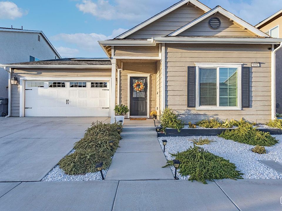 Welcome to 9004 Village Oaks Way, a beautifully maintained Lennar-built Farmhouse Style gem in the desirable Gossamer Grove community. This 3-bedroom, 2-bathroom home offers 1,666 sq ft. of refined living with tile floors throughout the busy walking areas, an open-concept kitchen with stainless steel appliances that overlooks the living room and abundant natural light. Enjoy the tranquility of a thoughtfully designed, drought-friendly backyard featuring lush artificial turf, custom concrete walkways and stunning landscape views. Plus a finished garage with linoleum flooring that's as spotless as the rest of the home. This one shines inside and out, just move in and start living.
