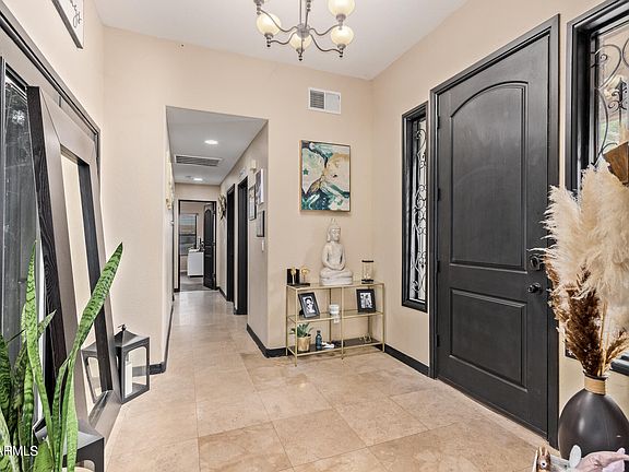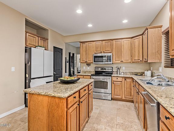 This magnificent, fully-fenced property w/no neighbors behind, is awaiting new owners! Featuring a large front yard, a 2-car garage, an RV gate w/extended driveway, & a private courtyard. The remarkable interior offers a welcoming foyer, stone flooring, recessed lighting, ceiling fans, & a spacious living & dining room w/entertainment niche & backyard access. The eat-in kitchen provides oak cabinetry w/crown moulding, granite counters, SS appliances, a pantry, and a center island. Unwind in the primary retreat including wood-look flooring & a spotless ensuite w/dual sinks. The expansive backyard offers a covered patio, shade trees, a fire pit, RV parking, & a detached guest house complete w/a kitchenette, a bedroom, & a bathroom. What are you waiting for? This energy-efficient beauty will not disappoint!