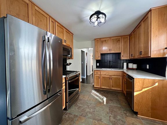 This beautifully updated story and a half home is a must see. The kitchen features newer cabinets, tile backsplash and quartz countertops. The high end GE stainless steel kitchen appliances are all newer and include a great gas 5 burner stove with built in air fryer. The main level also features an updated bathroom, 2 bedrooms and nice sized living room that offers tons of natural sunlight and wood floors. The upper level features an oversize bedroom that currently doubling as an office. The lower level features a large family room with bar and 4th non-conforming bedroom that is currently used for storage. The whole house features awesome updated lighting, new interior paint, new flooring in the upper and lower levels and paneled doors. The private backyard is fully fenced with an 8x12 storage shed. The 2 car garage offers great storage for toys and vehicles. Super convenient location close to shopping, parks, schools, ect.