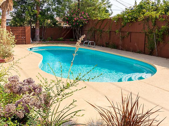 Attention first time or move up buyers you must preview this immaculately, beautifully maintained & updated pool home, which won't last long. Move-in condition & spotless single family house without any homeowner's association dues. Wrought iron security gates and fully fenced yards. Stone flooring at the front porch. Leaded glass front entry door into living room which includes a coat closet. Beautiful Oak wood flooring at entrance, living, dining room, hall & secondary bedrooms. Newer air conditioning & heating systems, dual pane windows, recessed lighting, as well as, paint inside & out. Granite counters in kitchen & bath. Stainless steel appliances include gas free standing stove & hood. Raised panel doors & ceiling fans throughout, Crown moldings complete the walls & ceilings. Separated from the secondary bedrooms the master suite has an en-suite bath plus walk-in closet. There is a pocket door into family room containing wall sconces & access to outside covered patio, pool & spa. Great kidney shaped pool for cooling off during the hot summer months or all year long. Quiet & private location.