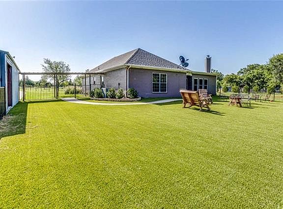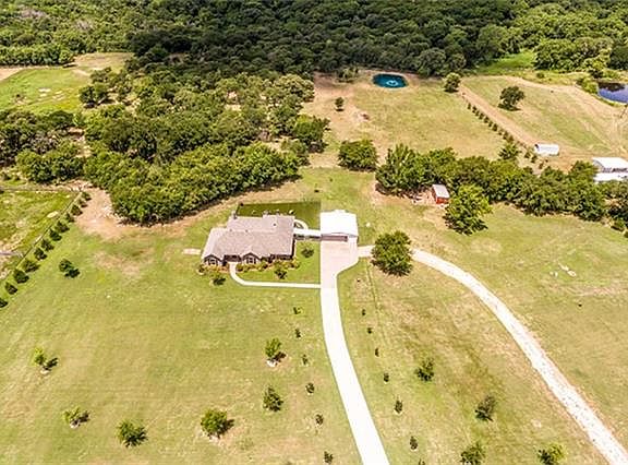 Set on 21+ park-like acres and just 15 miles north of DNT at Hwy380, this alluring country property features a beautifully updated home set privately behind a gated entry overlooking scenic views of pasture, trees & a pond. The home has been superbly & extensively updated, shows impeccably well & sells attractively furnished. The land is pristine, diverse & ideal for many uses whether its livestock or recreation with fenced pasture, a pond and a heavily wooded area at the back that adjoins almost 1700ft of Pecan Creek. Small barn with fenced lot for animals. Includes a ±980ft deep back up water well plus a whole home generator for piece of mind. Close enough in for commuters or a convenient ranch-like getaway.