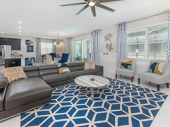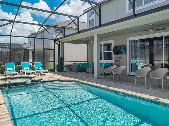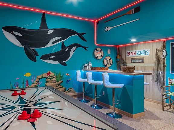 Welcome to your dream vacation home at Solara Resort, featuring a spacious 5-bedroom, 4.5-bathroom layout with a private south-facing pool and spa. This home is perfect for families seeking a comfortable base to explore Central Florida's attractions, located just 7 miles from Disney Property. Enjoy themed bedrooms, including a Pirate Ship and Beach Tiki Hut, and a fully equipped kitchen with dining for 8 both indoors and on the lanai. The home boasts a fully equipped kitchen, perfect for preparing meals for the family, and a dining area that seats 8. The themed game room and incredible themed bedrooms, such as the Pirate Ship and Beach Tiki Hut, add a unique touch to your stay. Relax in the private pool and spa, or enjoy a movie night with smart TVs in every bedroom. For an additional charge of $30 per day plus tax, you can heat the pool and spa. The resort allows a maximum of 3 cars, with specific parking rules to avoid fines. Enjoy access to Solara Resort's amenities, including the FlowRider Surfing Simulator for an extra fee, a splash park, a grand pool, and more. Situated on Sunshine Ridge Loop, this home offers easy access to popular attractions and amenities. Walt Disney World is just 6.6 miles away, Universal Studios 21.9 miles, and SeaWorld 16.3 miles. For your convenience, Publix Supermarket and dining options are only 3 miles away. Enjoy the best of both worlds with Atlantic Coast Beaches 83 miles and Gulf Coast Beaches 88 miles from your doorstep. The property is smoke-free and pet-free for your comfort. Complimentary Wi-Fi is provided, along with towels and linens. Additional rental items such as BBQs, cribs, and strollers are available. A starter welcome packet is provided, but guests are responsible for replenishing supplies beyond the initial stock. Check-in is seamless with online email check-in, and 24/7 on-call maintenance is available.