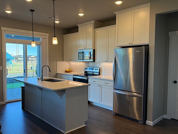 Inside, the open-concept floor plan welcomes you with a spacious and bright living area designed for connection and comfort. The gourmet kitchen features a large island, custom cabinetry, quartz slab countertops, full-height tile backsplash, and stainless steel appliances ideal for cooking, entertaining, and everyday living. Under-cabinet and pendant lighting create a warm, inviting glow, while luxury vinyl plank flooring runs throughout the main living spaces for a sleek and durable finish.