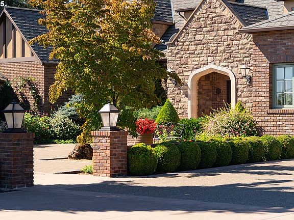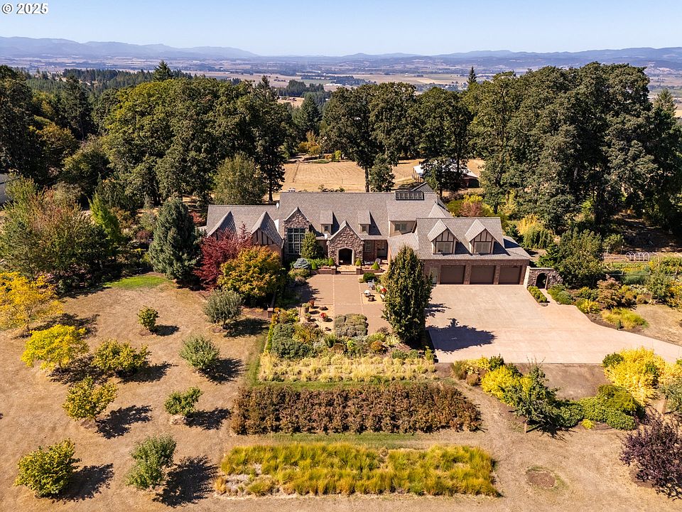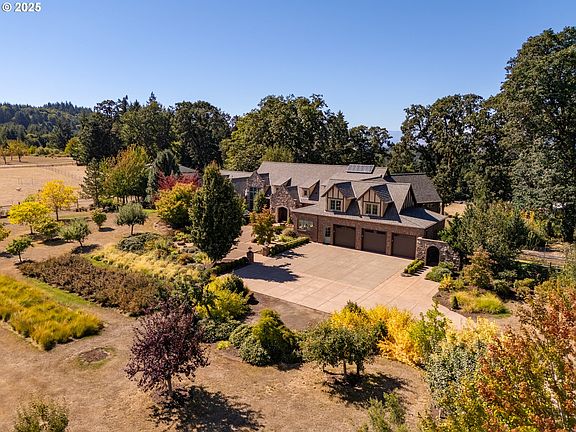 Gorgeous Acreage Estate in the Coveted Eola-Amity Hills. Nestled on 4.63 acres of fully usable land with breathtaking mountain and valley views, this exceptional custom-built estate offers a rare blend of timeless elegance and refined craftsmanship. Thoughtfully designed to showcase charm and character at every turn, the home features soaring vaulted ceilings, exposed wood beams, custom-built cabinetry, and beautiful granite countertops throughout. The traditional yet sophisticated architectural style, accented by a solid brick & stone exterior with warm wood details, exudes a prestigious and timeless appeal. Inside, a meticulously planned floor plan provides exceptional comfort and functionality. Highlights include a gourmet kitchen with a walk-in pantry, a sophisticated great room with dramatic beamed ceilings and expansive view windows, a spacious main-level primary suite, two dedicated offices, a craft room, three additional bedrooms, generous storage spaces, and a dedicated mechanical room. A custom-built elevator adds ease and convenience, offering effortless access to every level of the home. The exterior is equally impressive, featuring mature landscaping, a dedicated garden, a variety of orchard trees, and a fully fenced open pasture ideal for horses or farm animals. A 48' x 48' barn with three 12' x 12' stalls completes this remarkable property. Ideally located in the heart of Oregon Wine Country within the renowned Eola-Amity AVA, this estate embodies the best of rural tranquility and sophisticated living.