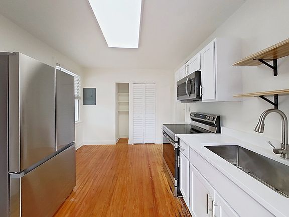 Step inside to discover a bright, airy floor plan anchored by newly refinished original hardwood floors that glow with natural light. The heart of the home is the brand-new kitchen, featuring sleek, cabinetry, gleaming stone countertops, washer/dryer hookups and a full suite of brand new stainless steel appliances, a rare find for an efficiency unit. Perfect for entertaining after a day in the sun.
