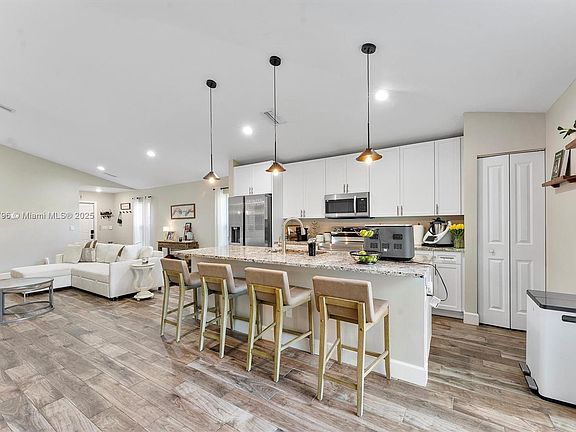 This spacious home features 13-ft ceilings, an open floor plan, and wood-look tile throughout. The kitchen offers granite countertops, stainless steel appliances, and white shaker cabinets. Additional highlights include impact windows, large laundry room, ceiling fans in every bedroom, and a huge fenced backyard with patio. No HOA. Excellent location near beaches, CityPlace, Downtown West Palm, the outlet mall, and I-95. Move-in ready!