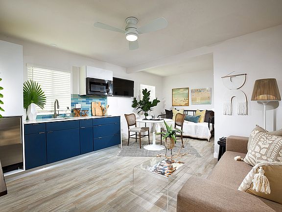 The Cove at PB is newly renovated and equipped with well-appointed interior features such as modern white and sapphire kitchen cabinetry, coastal-toned glass backsplash, white and smoky gray sleek quartz countertops, superb stainless steel appliances and fixtures, contemporary bathroom with luxury touches like an anti-fog bathroom mirror with dimmable lighting, and stylish vinyl flooring throughout.
