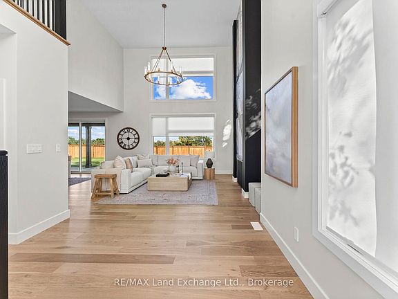 Stunning contemporary 2-storey home in Kincardine's most desirable new subdivision, Crimson Oak Valley! This lakeside enclave of executive family homes is only a short stroll to the gorgeous sandy beaches of Lake Huron. Elaborate and beautifully designed, this open plan home offers over 4000 sq ft of finished space on 3 floors with the WOW factor: soaring 19' ceilings, an elegant staircase to an upper landing, open to below. Beyond the welcoming porch, the foyer opens into the bright 2-storey great room complete with a designer gas fireplace, and an abundance of large windows allowing light to fill the space. The dining area is where future dinner parties will be hosted or family meals enjoyed, with easy access to large sliding doors, allowing effortless flow to the spacious covered porch and fully fenced backyard (plenty of room for future pool & hot tub!) The kitchen is the show-stopper with an oversized centre island, ideal for entertaining, ample quartz counters, and the walk-in pantry of your dreams! Completing this level is the convenient mudroom off the garage, 2 pc powder room and office/den for working at home. The second level offers 3 bedrooms, including a primary suite with grand double door entry, large walk-in closet with built-in shelving and drawers, and an ensuite bath with a dreamy soaker tub, glass shower and double vanity. The 2 additional bedrooms share the spacious hall bath, and the laundry is sensibly located on this level as well, with built in storage and counters. The beautifully finished lower level features almost 9' ceilings, luxury vinyl flooring, modern electric fireplace, bar area, 4th bedroom and full bathroom. Noteworthy additional features of this unprecedented home include custom window blinds, lawn irrigation system, and fully fenced back yard (with extra gate and access off Lake Range Dr). Discover the perfect blend of style, comfort and lakeside charm in this alluring new upscale development, just minutes south of Kincardine!