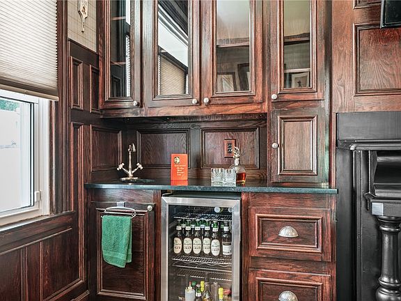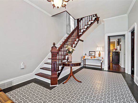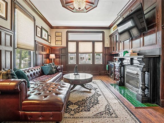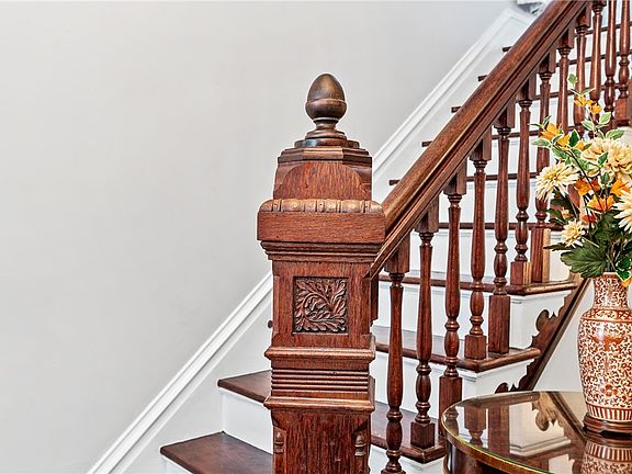 Beautiful and meticulously maintained Victorian style home , 3142 square feet on 3 floors Spacious entry welcomes you w/ new ceramic flooring, & original woodwork.1st floor boasts paneled den, accented ceiling, built in shelving, pocket doors,mini fridge, decorative fireplace & luxury vinyl flooring.Large dining room features decorative fireplace.Convenient 1st floor plan has Cozy Living rm & full bath.Kitchen features Corian counter tops,custom wood cabinets stainless appliances & breakfast area.Enjoy access to wrap around deck overlooking flat fenced in yard.2nd floor features 4 bedrooms,2 decorative fireplaces, full bath w linen closet &laundry rm.Finished 3rd floor can be guest suite w/ kitchenette, spacious full bath, glass enclosed shower, armoire &furniture style vanity.Included is 1 bedroom, office ,living room , electric fireplace. One bedroom could be office space,Basement hasroom for storage work area &full bath.Lrg 2 car large garage has man door, heated space &workshop.