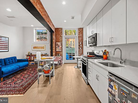 Rare opportunity to own a piece of Capitol Hill history in the beautifully restored Edmonds School. Originally built in 1903 and thoughtfully reimagined by award-winning designer Daryl Carter, this boutique development seamlessly blends timeless architectural character with sophisticated modern living. This stunning 1-bedroom, 1-bath condo features soaring 10+ ft ceilings, exposed brick walls, and wide-plank hardwood floors that radiate warmth and style. The large glass-pane door fills the living area with natural light and provides direct access to a private outdoor patio, perfect for morning coffee or evening relaxation. The kitchen boasts Quartz countertops, gas cooking, and Bosch stainless steel appliances, ideal for both everyday living and entertaining. The luxurious bathroom offers a wide vanity, custom tile flooring, and a glass-enclosed walk-in shower, complemented by a Porcelanosa dual-flush toilet for water efficiency. The spacious bedroom includes a walk-in closet with built-in shelving, while the in-unit washer and dryer and Ecobee thermostat add modern convenience. Residents enjoy secure building access, a bike storage area, and a common deck with grills ideal for outdoor gatherings. The elevator building is pet-friendly and pre-wired for Verizon Fios. Located in the highly sought-after Stanton Park neighborhood, this home offers easy access to Union Station, Eastern Market, Whole Foods, Trader Joe’s, the U.S. Capitol, and Lincoln Park—as well as nearby libraries, bike share stations, and Metro access for a quick commute to Amazon’s new Crystal City headquarters. Experience the perfect blend of historic charm and modern elegance in this truly exceptional Edmonds School residence.