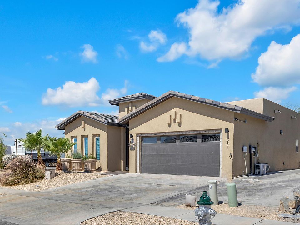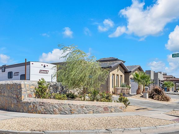 Stylish corner lot gem in the Eastlake Valley subdivision! The exterior features a modern stucco finish, landscaped desert charm, and a wide driveway with RV access. Inside, enjoy 3 bedrooms and 2 baths, with a cozy living area that flows into a spacious dining space. The kitchen shines with granite counters, sleek cabinetry, and a center island with extra seating. The master suite is a retreat of its own, offering a large walk-in closet and private bath with double vanities and a walk-in shower. Outdoors, the huge backyard boasts a covered patio and an additional fenced area, perfect for pets or extra privacy. A rare find blending style, comfort, and function—your perfect Eastlake Valley haven awaits!