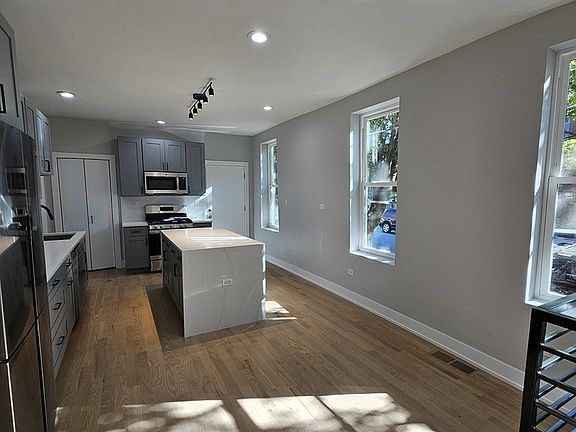 Sun-drenched New Construction 3bed/2bath duplex down. This corner unit was just gut renovated with designer finishes. Main floor features open floor plan w Kitchen opening up to dining. Kitchen features oversized island with waterfall Calcutta quartz counters, gray cabinets with soft close features, tons of storage and pantry area. Full stainless steel appliances including dishwasher. 2 large bedrooms on main floor with ample closet space and sunlight. Main floor has hardwood floors. Lower level features family/living room and large storage closet. Additional 3rd bedroom, full sized bathroom and laundry center with storage also located in lower level. Large fully enclosed metal porch in rear of unit perfect for grilling. Includes Central AC/Heat and in unit side by side Washer/Dryer. 2 parking spots included in rear of building. Available 11.1