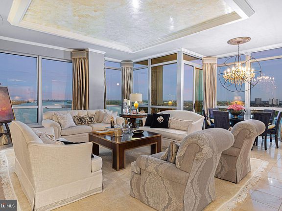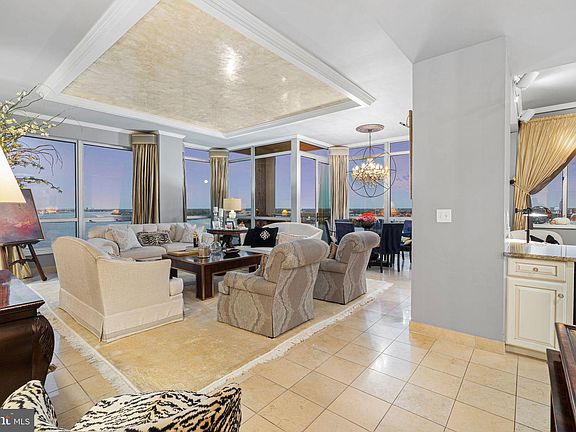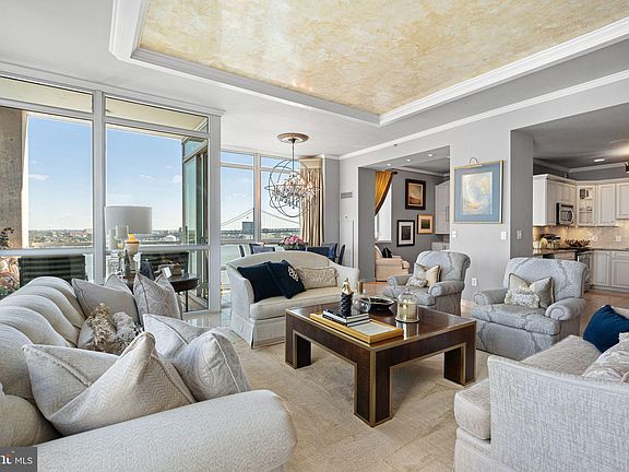 From the moment you step through the doors of P1501, it’s immediately clear this home has been designed with no detail overlooked. A sense of quiet elegance fills the space, beginning in the foyer, where specialty wall finishes shimmer beneath a Schonbek crystal chandelier. The polished marble tile flooring, which continues throughout the residence, sets a tone of refinement, while a double coat closet adds concealed functionality. Just off the entry, the powder room offers a touch of sophistication with its custom vanity, stone countertop, and designer lighting—a perfect welcome for guests. Heading into the main living area, the home opens to breathtaking scale. Ten-foot ceilings, crown moulding, and floor-to-ceiling windows showcase uninterrupted views of the Delaware River and Ben Franklin Bridge, bathing the interiors in natural light. The coffered ceiling, finished in a Venetian-inspired, hand-painted metallic plaster, captures the glow of day and the shimmer of evening chandeliers. Imported draperies frame the walls of glass. Suspended above the dining table, a Swarovski crystal orb chandelier becomes a sculptural centerpiece, highlighting this seating area. Continuing into the kitchen, form and function unite in harmony. Granite countertops contrast beautifully with custom cream cabinetry detailed with glass fronts, complemented by a natural stone backsplash and under-cabinet lighting. A built-in wine refrigerator and full stainless-steel appliance package enhance the space’s practicality, while the open layout encourages both culinary creativity and effortless entertaining. Every element here feels balanced—warm, welcoming, and meticulously crafted. Beyond the kitchen, the den transitions into an intimate media room, enveloped in sound thanks to the built-in surround system. The polished marble continues underfoot, maintaining visual flow, while layered lighting creates a cozy ambiance ideal for film, music, or quiet evenings in. The den features custom built-in cabinetry thoughtfully designed to conceal multimedia components, maintaining a clean, streamlined aesthetic. Versatile in function, this space transitions effortlessly between a media room as currently styled, a home office, or an extension of the kitchen for those seeking an open, connected layout. Stepping through glass doors, the balcony extends the living space outdoors. Here, the river and skyline unfold in full panorama—the bridge’s architectural lines rising gracefully above the water. It’s a peaceful setting that feels miles away from the city below. A frost panel design, glass door separates the private wing from the entertaining spaces beautifully, while allowing light to filter through. Each of the three bedrooms offers its own unique vantage and luxurious feel. The primary suite is a private retreat with a spa-inspired en-suite bathroom, walk-in closet, and serene river views. Additional bedrooms ensure ample space for both relaxation and productivity. Every bath is finished with custom tilework, and high-end fixtures, continuing the home’s elevated aesthetic. Completing the offering are two premium parking licenses and a storage unit, ensuring convenience and peace of mind. All crystal light fixtures convey. Waterfront Square Condominium & Spa is Philadelphia’s premier gated waterfront community, offering 24/7 guard and gate security, concierge. Residents enjoy resort-style amenities including an indoor pool and hot tub with river deck, fitness center, sauna and steam rooms, massage suites, and community lounges. The three-level garage supports Philadelphia’s largest green roof, and landscaped gardens across 9.5 acres of manicured riverfront grounds. On-site management and an advanced closed-circuit security system ensure peace of mind, while Global Limousine shuttle service provides weekday transportation to and from 30th Street Station.