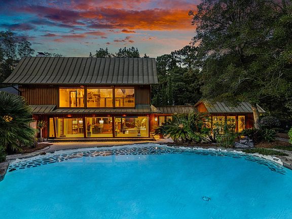 A one-of-a-kind contemporary masterpiece, 901 Red Coat Run is tucked within the private Snee Farm golf club community. It is an inspired residence where architecture, artistry, and nature exist in seamless dialogue. Reimagined in 2002 under the direction of renowned Charleston architect Dan Sweeney, the home balances timeless craftsmanship with research-driven design, resulting in a sanctuary that feels both enduring and refreshingly modern.The exterior sets a sculptural tone with Eastern Spanish cedar siding, a resilient copper roof, and bold purple heart wood doors and columns. The cantilevered staircase becomes a striking architectural centerpiece, appearing to float in space while showcasing the craftsmanship and structural ingenuity that define the home.Custom architectural glass windows scatter dappled light across the interiors, while telescope doors blur the threshold between dining and landscape. Vaulted ceilings soar overhead, animated by three iconic Ingo Maurer fixtures. At the heart of the home, the open-concept living room is equal parts statement and retreat. Anchored by a custom terrazzo concrete bar and a sleek gas fireplace, it is a space designed for both quiet reflection and vibrant entertaining. The kitchen continues the narrative of understated luxury, appointed with GE Monogram refrigeration, Thermador double ovens, a warming drawer, a built-in Miele coffee station, and a Sub-Zero wine fridge. Moments of serenity are found throughout, from the solarium with tilted glass windows that invite the outdoors into the primary bath's Kohler Sok overflowing tub, filling from the ceiling in a cascade of effervescent bubbles. Outdoors, a custom designed pool mimics the feel of a natural spring and is framed in crushed oyster tabby that pays homage to the Lowcountry's heritage. The backyard extends this sense of retreat with a park-like atmosphere where mature plantings, winding pathways, and broad lawns create a peaceful rhythm of light and shade. An installed mosquito spraying system ensures that time spent outdoors remains comfortable and bug free, allowing every corner of the landscape to be enjoyed throughout the warmer seasons. The property itself is a lush, tropical haven that unfolds toward a private lake where coastal birds and wildlife provide a constant, living backdrop. 901 Red Coat Run is more than a residence. It is a contemporary work of art, fortress-like in strength yet deeply connected to its natural surroundings. A singular opportunity to inhabit a home that is as livable as it is architecturally extraordinary.