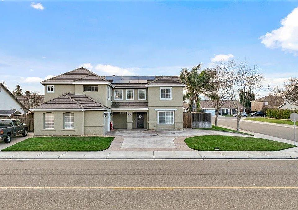 This spacious home features 6 bedrooms with two of the bedrooms downstairs along with a full bath. Four additional bedrooms upstairs along with a HUGE bonus room that is wired for surround sound and a large loft! Ceiling fans in all bedrooms and common areas. The oversized primary bedroom and bath boast granite counters, separate tub/shower and a spacious walk-in closet. The kitchen features a high-end Thor gas range, wine refrigerator, granite countertops, oversized kitchen island, lots of cabinets and a huge walk-in pantry. Custom Travertine floors are featured in the kitchen that opens to the dining room and living room with fireplace. Stamped concrete circular driveway offers additional parking along with covered RV access in the side yard. Summer is coming and you will enjoy entertaining on your covered patio with built-in BBQ and refrigerator overlooking the sparkling pool with waterfall slide. Access the rear yard from the sliding glass doors or the full bath. Indoor laundry. NEWER efficient air conditioning units. Leased solar.