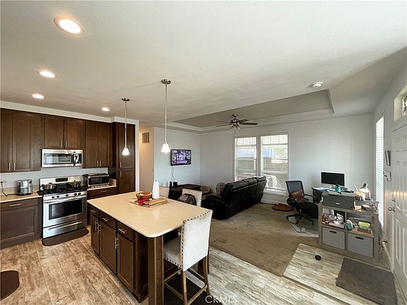 One of the kind,open floor plan with living room, dining area and kitchen combo. Upgraded Corian countertop island. Flooring are carpeting and vinyl.