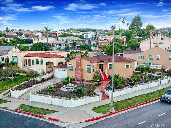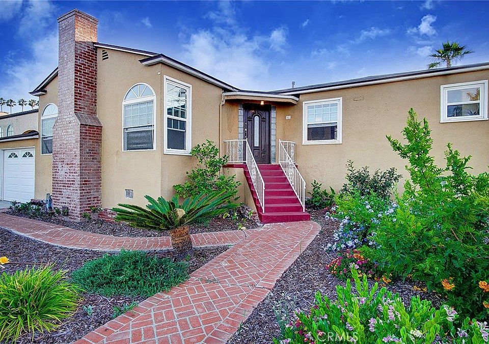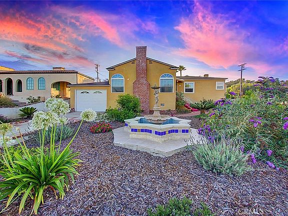 This is a Charming Gem seated on a Raised Corner Lot. As you walk up the stairs to the front door on your left you will a beautiful statue waterfall feature with mosaic tile. There is a very open view of the neighborhood. As you enter into the Formal Entry you will turn to the left where the Living Room features Wonderful Radius Windows that let in the Natural Light during the day. There is also a Cozy Wood Burning Fireplace. The Kitchen includes Stainless Steel Appliances, Refrigerator, Dishwasher, Microwave plus a Gas Cooktop and Double Oven. The room you go through to the Kitchen can be used as either a Formal Dining Room or Family Room which has French Doors leading out to a Small Courtyard Area on the Side yard. One Bedroom includes a 1/2 Bathroom and the Primary is next to the Full Bathroom which includes a Built-In Vanity Table. Both Bedrooms have French Doors that exit to a Wood Wrap Around Patio Deck in the Backyard. Throughout you will see Crown Molding, Wood Laminate and Ceramic Tile Floors. Central Air. Laundry Room is inside and includes Cabinet Space. A 1 Car garage with Automatic Garage Door and Driveway allows for more parking. You will enjoy your summers being just 2 miles from the Beach.