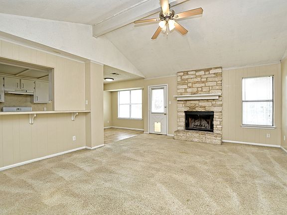 3-2-2 Great starter home in GT! Mature oaks. Front covered porch. Stone masonry front. White appliances. galley style. Breakfast area. Serving bar at kitchen opening to family room. Over-sized utility. Stone wood-burning fireplace. Tile and carpet in bedrooms. White bedroom doors. Ceiling fans. Wood privacy fence with gate. Storage building in back. Rosebush. Back over-sized uncovered concrete patio. Attic pull-down ladder in garage.