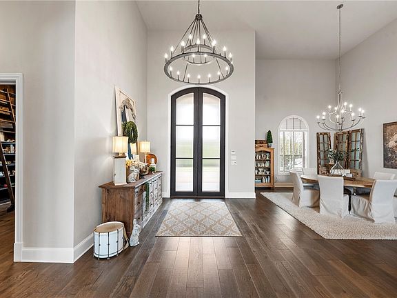 A distinguished library with 12-foot Alderwood bookcases conceals a panic room entrance. The laundry room, with dual washer, dryer connections and family cubby space, adds functionality. The 3-car garage boasts epoxy flooring and ample cabinetry.