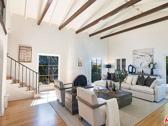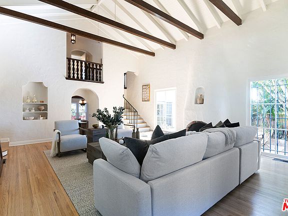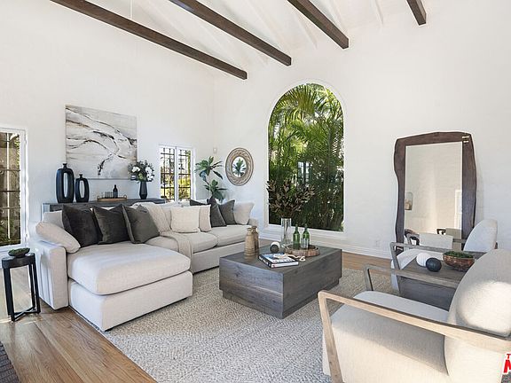 Character Spanish charmer artfully combines old-world elegance with modern amenities. Enter through the tiled foyer to the majestic living room with double-height, wood-beamed ceilings, decorative fireplace, and oversized arched window letting in abundant sunlight. Generous formal dining room with vintage light fixture leads to the sunny kitchen with brand new stainless steel stove and refrigerator. Separate breakfast room leads out to a lushly-landscaped, Spanish tile courtyard, perfect for dining al fresco. Back yard also boasts a refinished wood deck, another Spanish tile patio, and a free-standing accessory building, which could be used as a large office or rec room. Upstairs, find three bedrooms and two brand-new, spa-like bathrooms, including one ensuite to the primary bedroom. Newly refinished hardwood floors, newly installed central HVAC, and downstairs powder room round out the amenities of this special home. Close to all the dining, shopping, and worship options the red-hot Pico Robertson neighborhood has to offer. A true gem!