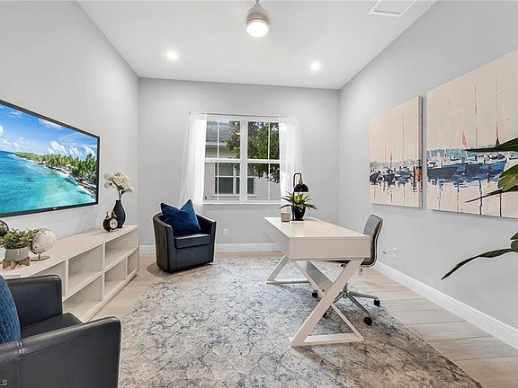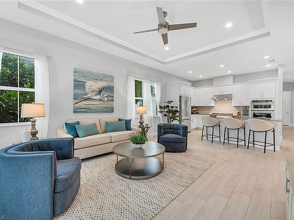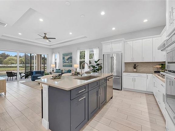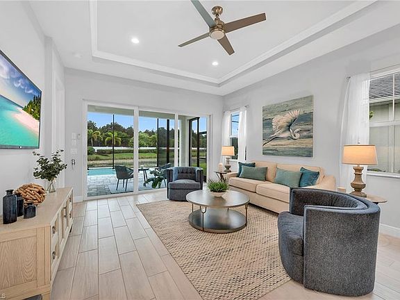 Indulge in the epitome of luxury with this meticulously crafted, single-story residence situated in one of the most coveted guard-gated communities in all of Naples – Azure at Hacienda Lakes. Enjoy immediate occupancy this season and endless custom upgrades that exemplify a commitment to sophistication and opulence. This luxurious Baypointe model promises a seamless blend of timeless elegance and modern convenience while boasting two large bedrooms, a versatile third bedroom/office/den/flex, two full baths, a chef's kitchen with a wall oven and natural gas cooking, a private heated pool with custom water features and an oversized two-car garage. Quietly tucked along one of the most beautiful streets within Azure, this newer construction residence also features large volume and tray ceilings, a beautiful entry patio with a brick paver driveway, hurricane-impact windows and doors throughout, an expansive screened lanai that is perfect for entertaining with friends and family and the ability to purchase fully furnished/turnkey for effortless enjoyment. With nearly 1,600 square feet of air-conditioned living, panoramic lake views, and coveted southwestern exposure, this is an incredible opportunity for part-time use, a strong rental asset or year-round enjoyment. Residents of Azure also have access to a beautifully designed clubhouse, a resort-style heated pool and spa, tennis and pickleball courts, a private library, a billiards room, a world-class fitness center, an expansive yoga studio and much more. Within walking/biking distance to numerous golf courses, fine dining, shopping and entertainment. Will not last long.