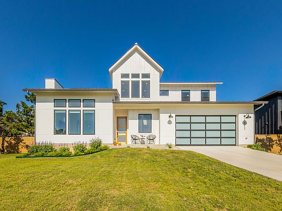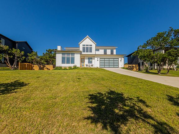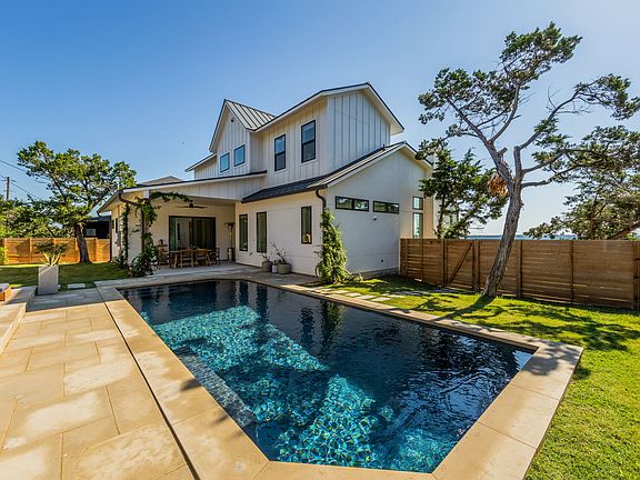 Welcome to Grandview Drive. This Modern farmhouse sits atop a scenic ridge in South Jonestown Hills. This spacious design gives you the ultimate getaway that will make you forget your home. With its classic design, gorgeous pool and patio Entering, you'll notice the large windows bringing in the amazing views, and sometime when the water comes back, you'll enjoy a view of Lake Travis Sandy Creek. Gorgeous sunrises will be your perfect start to a day. The kitchen, with its large island and marble subway tile, coordinates perfectly with the quartz countertops and white shaker cabinets. The primary suite has its own door to the back patio and en suite with a large walk-in shower with a bench and rain shower fixtures. An additional living area is located on the second floor with two guest rooms, a second bath with dual vanity sinks, and plenty of room for linens and storage with its extra wall of cabinets. This is Hill Country living at it's Finest!