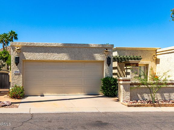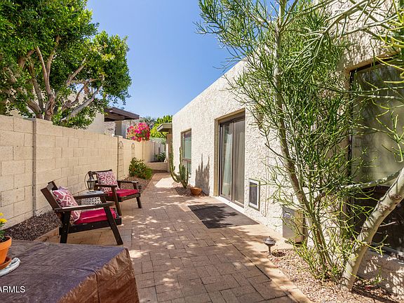 Amazing Brick built 3bed 2bath single level home in sought-after Pointe South Mountain community. This home is both warming and energy efficient with high quality upgrades, Upgrades include; Low E dual pain windows, sky lights with shade screens, new A/C, W/H, Kitchen w/ stainless steel appl, Brazilian Granite counter tops w/ Leather finish & abundant storage. Cozy beehive f/p & French doors that open to gated patios w/ desert landscaping, putting green, lighting, irrigation & a tranquil water feature. Flexible floor plan offers 2 bdrms plus a third ideal for an office/guest room. Stylish Saltillo and Slate tile floors, smooth walls & a dog door add functional charm. Just steps from Pima Canyon trails, comm pools, Rustler's Rooste/ AZ Grand. This is truly a home to love.