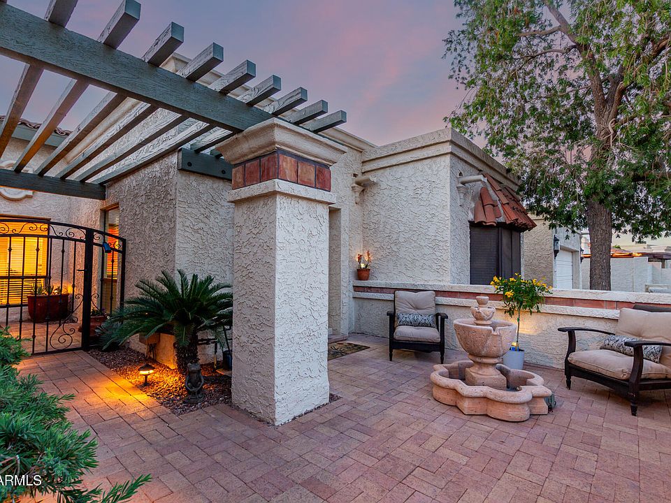 Gated patiosSingle level homeFlexible floor planDesert landscapingTranquil water featureBrick builtFrench doors