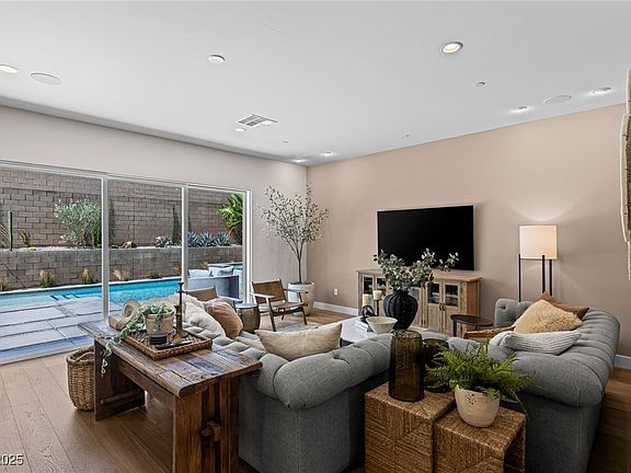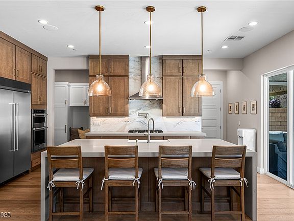 defines the kitchen, complete w/KitchenAid appliances, a pot filler, & a large pantry. Grab a drink from the wet bar, open the 12’ by 8’ multi-slide door in the great room, & head out back to enjoy the pool, spa, and abundant patio space. Upstairs, the primary suite offers a serene escape, with a spa-inspired bathroom where you can indulge in the rainfall shower & freestanding tub.