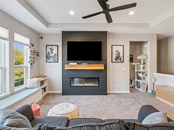 Electric fireplace accent wallFinished basementCustom touchesSleek finishesWelcoming entrywayOversized family roomWalk-in closet