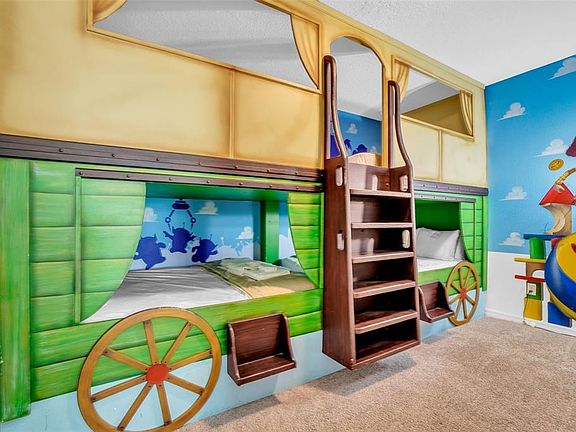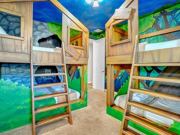 Stunning 9-Bedroom Vacation Home in Solara Resort – Fully Upgraded & Turnkey Welcome to this exceptional 9-bedroom, 6.5-bathroom vacation retreat located in the highly desired Solara Resort, just minutes from Walt Disney World®, Universal Studios, SeaWorld, I-Drive, Disney Springs, and Central Florida’s renowned beaches. Offering 4,363 square feet of thoughtfully designed living space and more than $170,000 in upgrades, this home presents an outstanding opportunity for investors or families seeking a luxury vacation residence. Designed to comfortably accommodate large groups, the property can host up to 30 guests, including 16 adolescents and 14 adults. There are seven private king bedrooms, each designed with its own distinct style, along with four full-over-full custom bunk rooms ideal for children and teens. Notable features include a hand-painted, custom-designed treehouse and cabin-themed bedroom with built-in bunk beds, as well as an additional Toy Story–themed bedroom with custom built-ins and professionally painted artwork. The main floor offers an expansive open-concept layout with multiple living and gathering areas and includes a master ensuite for added convenience. This home is offered fully furnished and is ready for immediate use or rental, with all furniture, décor, linens, towels, kitchenware, pool equipment, and baby equipment included. Entertainment options are extensive. The air-conditioned garage has been transformed into a glow-in-the-dark arcade, and the home provides multiple common areas ideal for hosting and relaxation. The outdoor living space features a covered patio, heated pool, and hot tub, creating a private oasis for guests of all ages. Residents and guests also enjoy access to the exceptional amenities offered by Solara Resort. These include a heated grand pool, the FlowRider® surf simulator (available for an additional fee), an on-site bar and grill, coffee bar, sundries store, fitness center, sand volleyball court, full-sized soccer and basketball courts, indoor and outdoor lounges, workstations, a tween and teen hangout center, playground, pool bar, poolside cabanas, and a game room featuring a multi-sport virtual simulator for golf, soccer, football, basketball, and more. Guests with a reservation at the home receive complimentary entry to these amenities during their stay. With its prime location, extensive upgrades, themed living spaces, and access to premium resort amenities, this Solara Resort property offers a rare opportunity for those seeking a turnkey vacation home or high-performing short-term rental investment.