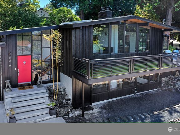 Step into timeless elegance of an iconic mid-century home featured in Atomic Ranch magazine. This meticulously restored masterpiece offers a seamless fusion of modern luxury and classic design. With custom details like mahogany floors and cedar ceilings, every corner exudes sophistication. Enjoy views through picture windows and cozy up by one of two gas brick fireplaces. Entertain effortlessly in the lounge or gourmet kitchen. After a long day relax in the spa-like bathroom or outdoor cedar hot tub. Privacy abounds with a lush landscape and custom rock fire pit. Work from home in the serene office or stay active in the workout room. Steps away to dining, Ferry, and Lincoln Park, this home offers the ultimate in convenience and lifestyle.