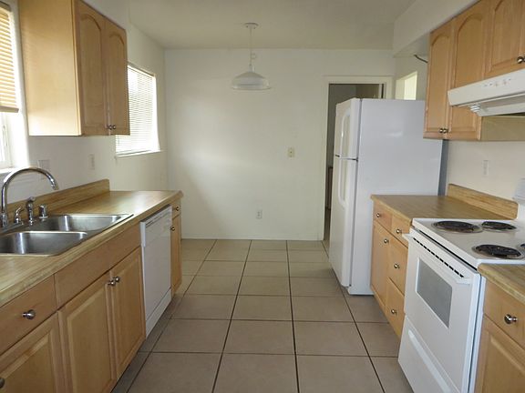 3Br, 1.75Ba, kitchen dining, living room with fireplace, den w/ fireplace, dining area off the kitchen, refrigerator, dishwasher, stove, ceiling fans, washer & dryer hookups, carpet & vinyl, gas furnace, evaporative cooling, fenced yard. No pets.