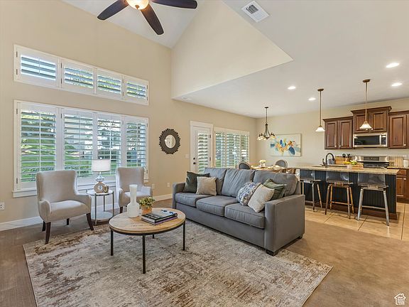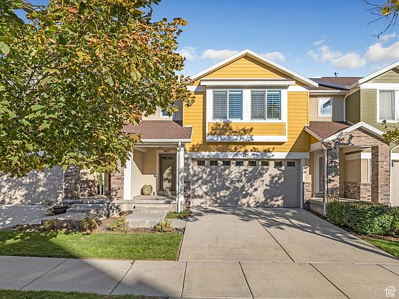 Perfectly located near shopping, dining, and walking trails-and just minutes from I-15-this beautiful home is ready for its new owners! The main level features soaring vaulted ceilings in the living room and a well-appointed kitchen with granite countertops, a center island, pantry, and stainless-steel appliances, including a gas range and a French-door refrigerator that stays. A convenient half bath and two-car garage complete the main level. Upstairs offers a versatile loft, three bedrooms, and two full bathrooms, including a spacious owner's suite with a walk-in closet and en-suite bath featuring a soaking tub and separate shower. The laundry is also located upstairs near the bedrooms, and the washer and dryer are included. Additional highlights include beautiful plantation shutters throughout and a covered patio off the main living area. From the beautiful interior finishes to the exceptional community amenities-clubhouse, pool, hot tub, fitness room, and playground-this home offers the perfect blend of style, comfort, and location. Don't miss the chance to make it yours!
