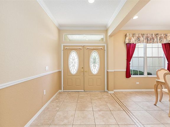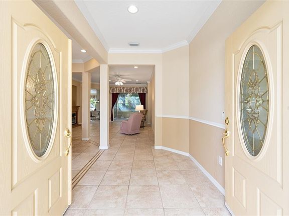 One or more photo(s) has been virtually staged. Del Webb Kingston Model – Private, Professionally Landscaped Lot Looking for one of the most sought-after models in Del Webb? This Kingston 3-bedroom, 2-bath home sits on a private, professionally landscaped lot and offers exceptional comfort and style. You’ll love the spacious floor plan featuring a dining room, living room, and large family room, with ceramic tile throughout except for the bedrooms, which have beautiful engineered wood flooring. The updated kitchen boasts stainless steel appliances, including a gas range, bottom-freezer refrigerator, and 42” cabinets with over and under lighting. Two solar tubes and recessed lighting add brightness throughout. The living room features an electric fireplace, and the dining room is enhanced with recessed lights and a chandelier. Photos of 2 guest bedrooms and lanai are virtual. some furnitures available Enjoy year-round relaxation in the enclosed lanai, level with the main flooring, finished in ceramic tile, and equipped with its own mini-split heating and cooling system. Step outside to the 17x14 paver patio with an 18-foot Sunsetter manual awning and dusk-to-dawn lighting — perfect for outdoor enjoyment. The primary bedroom features a tray ceiling and crown molding, with an en-suite offering raised vanities, a large shower with bench, and a separate soaking tub. The indoor laundry room includes a Bosch washer and dryer (new 2024), plenty of cabinets, and a folding counter. Additional highlights include R30 insulation throughout, an extended 4-foot garage with golf cart garage, drop-down attic stairs, and a mini-split HVAC in the garage. Major updates include new roof (2024), HVAC (2021), Rinnai tankless hot water system, and a security system. Don’t miss this exceptional home — call today to schedule your private showing! Photos of 2 guest bedrooms with furniture and lanai are virtual.