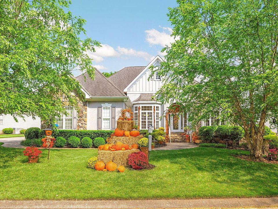 The great room is an inviting centerpiece with a wall of windows, vaulted ceiling, gas fireplace, and ceiling fan. Just off the kitchen, the formal dining room impresses with a vaulted double tray ceiling and a large bay window.