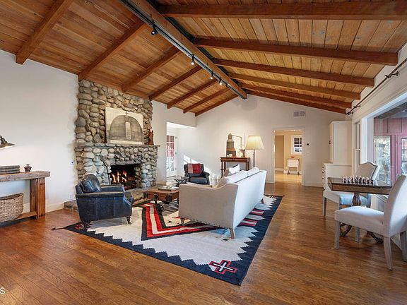 Located in one of Ojai's premiere areas, this remarkable property spans over 1.2 acres and boasts sweeping views of Topa Topa Mountain and Chief Peak. Move-in ready and full of charm, the main home features wood floors throughout and a grand living room with a river rock fireplace, a picture window framing mountain vistas, and a pitched ceiling with exposed wood beams.The kitchen blends vintage charm with modern functionality, featuring an O'Keefe & Merritt stove, built-in Bosch oven, and a breakfast bar for casual meals. The formal dining room opens directly onto two patios, creating the perfect ambiance for outdoor dining under the stars.Retreat to the primary suite with a cedar-lined closet and an en suite bathroom, while two additional bedrooms, each with private bathrooms, offer comfort and convenience. A dedicated home office with a private entrance, along with a well-equipped mudroom and laundry room featuring a 3/4 bath, add to the thoughtful layout.The property also includes a two-bedroom, one-bath guest house, ideal for hosting or as an income-generating rental. Car enthusiasts will appreciate the three-car climate-controlled garage, complete with an adjoining studio--perfect as an art space, home gym, or ultimate man cave with stunning mountain views.This unique Ojai gem offers a seamless blend of indoor-outdoor living, modern amenities, and timeless charm, all in a location that captures the essence of Ojai's natural beauty.