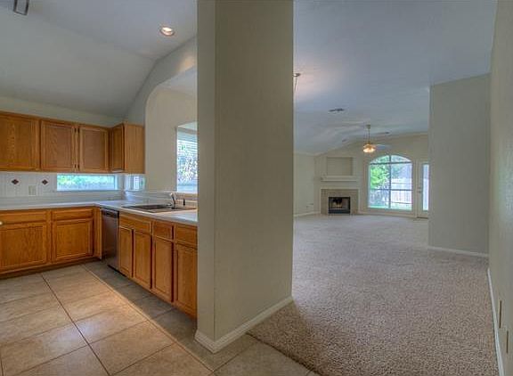 Terrific single level Newmark custom in The Settlement. Nice lot with magnificent tree in front yard. High ceilings, art niches, large ceramic tile flooring in foyer, kitchen and breakfast. Lots of cabinets and built in hutch in kitchen, and breakfast room, at the front of the home, shaded by the trophy specimen shade tree. Formal dining area adjacent to large den with corner fireplace. Great master suite with garden tub and separate shower in bath. Security system and four ceiling fans. Convenient.