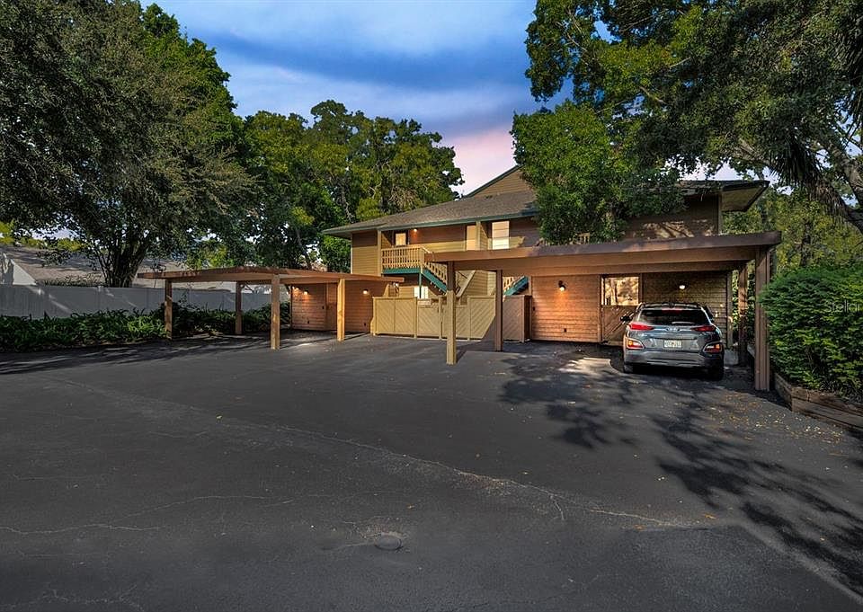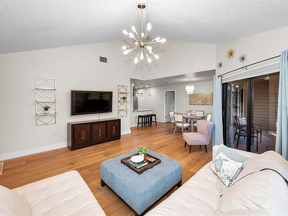 Discover this meticulously maintained, approximately 1,050 square foot residence offering two spacious bedrooms and two full bathrooms. The primary suite delights with an en-suite bathroom and generous walk-in closet, while the open living area boasts vaulted ceilings and engineered hardwood floors installed in 2022. Enjoy tranquil mornings or evenings on the screened-in balcony, accessible from both the living room and the primary bedroom. Custom blinds throughout provide effortless privacy and light control. Additionally, the property features a covered parking area with a private courtyard offering additional relaxation space and secured storage space. Modern updates abound, including a remotely monitored air conditioning system replaced in 2022 with routine maintenance, updated ductwork (2015), a new water heater, water softener, and a water filtration system were also added in 2024. The kitchen is well-appointed with stainless steel appliances (replaced in 2015), beautiful granite countertops, and a garbage disposal. A washer and dryer are included and convey with the home. Tucked within a serene, beautifully wooded community, this property offers easy access to the clubhouse and pool. Association fees include internet, cable, water, sewer, garbage, grounds, and grounds maintenance. Experience turnkey living with thoughtful upgrades and a peaceful setting—schedule your private tour today!