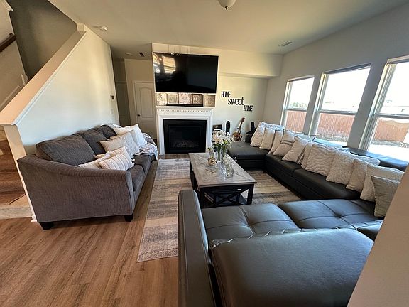 Open floorplan with luxury vinyl plank (LVP) flooring throughout the main floor. Kitchen equipped with a gas stove, walk-in pantry, and a large island with seating area. First floor includes a bedroom and living room. Upstairs boasts 4 additional bedrooms and a spacious loft area. Primary bedroom features a very large walk-in closet. Primary bath includes double sinks, a separate vanity area, and a generous-sized shower. Convenient laundry room with washer and dryer included, located on the 2nd floor.