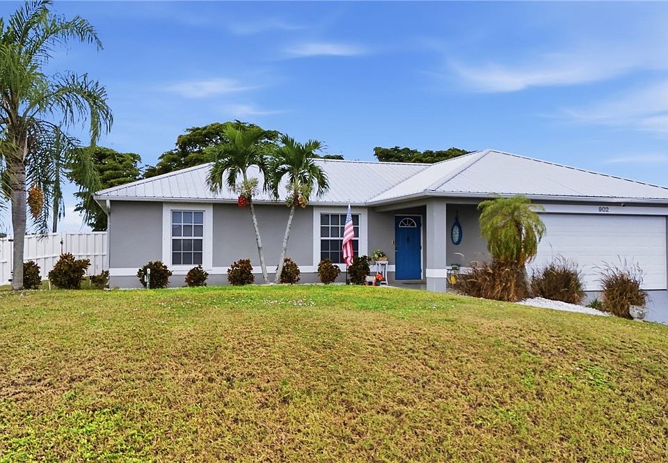 Welcome home to this charming 3-bedroom, 2-bath property on an oversized corner lot in Cape Coral. Step inside to an open floor plan with cathedral ceilings, tile flooring in the main living areas, and vinyl in the bedrooms. The kitchen offers plenty of cabinet space, a large island, and 2020 appliances, making it the perfect place to cook and gather. A pre-listing inspection has already been completed, and the 2022 metal roof adds long-term peace of mind.