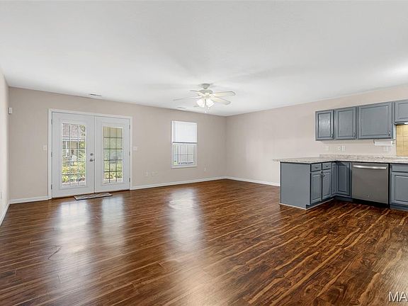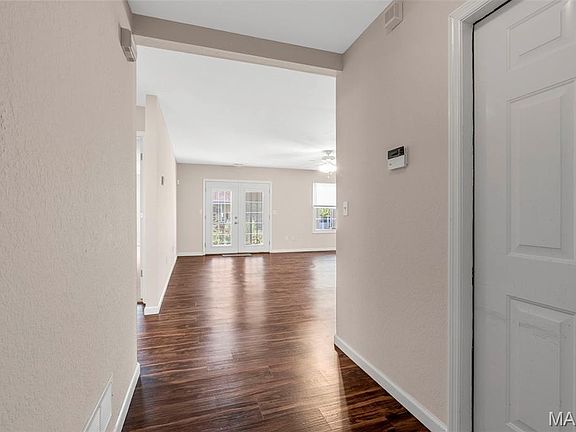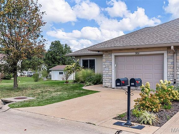 Welcome to this charming 55+ Villa offering one-level living with no stairs! This end unit home features an open floor plan, primary suite and ensuite, secondary bedroom, and half bath. The kitchen boasts updated appliances and large pantry. New bedroom carpeting was added in 2024. The spacious great room highlights French doors with built-in blinds and sliding screen, opening to a private concrete patio surrounded by custom landscaping. The attached garage includes a newer door with opener, plus a thermostat controlled heater. Conveniently located just half a mile from the aquatic center, Scenic Regional Library, and a local diner, with wide concrete sidewalks that provide easy strolling. This villa provides maintenance free exterior, lawn care, and snow removal.