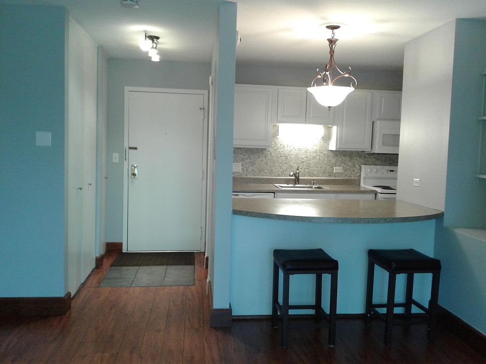 High-end remodeled deluxe 1 BR/Studio, 1 Bath, Living room, Bedroom, 2nd Floor 600 sq. ft. condo located in highly sought-after Terrace of Elk Grove Village Condominiums, 902 Ridge Square Unit 216. Very clean and freshly painted throughout with neutral colors. Laminate flooring throughout. New decorator lighting. Remodeled kitchen and countertop, with appliances, range hood, dishwasher and new microwave. Remodeled bathroom with new wall tile, toilet and new medicine cabinet. Plenty of closet space. Beautiful view from the balcony.. The laundry room is on the second floor. Storage lockers are on the third floor. Beautiful Clubhouse offering a swimming pool, sundeck, party room, fitness center, billiards room and the Business Office with WIFI facilities. Close to schools, shopping and expressway. One year lease minimum, rent $975.00 per month. One month security deposit required. Rent includes water, heat, garbage removal and assigned parking space. No pets. Will need to fill out an application. Good and complete credit report, including background check, will be required. A must-see condo. Available immediately. Owner pays for water, heat, and garbage removal. Tenant pays for electricity and TV.