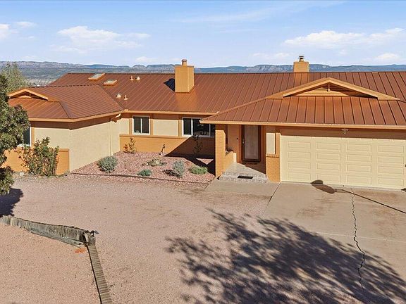 Spacious home with amazing Red Rock Views situated on 1.43 acres...Stucco and brick exterior tastefuly updated with both metal and tile roofs...Large yet cozy living room with gas log fireplace and built in bookcases and planters...LR exits to large covered rear patio to enjoy VIEWS...Kitchen beautiful butcher block island, wall pantry, all appliances, and engineered stone counter tops...Formal dining and family room combo open off of kitchen....Primary Suite w/ patio access, full bath with double vanity, seperate tub/shower and walk in closet....Oversized laundry for hobbies and crafts, 2 guest bedrooms and a full guest bath... Double garage, exterior 24'x36' shop...12'x53' RV carport....Fully fenced backyard....You have to see this one!
