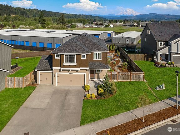 This 2018 home offers 5 bedrooms, with a bedroom and 3/4 bath on the MAIN LEVEL & a bonus room upstairs that provides more room for entertaining, relaxing or working from home. There is a STUNNING Mt. Rainier view! The spacious kitchen w/gas stove is a chef's dream with tons of counter space & cabinetry. Efficient tankless hot water heater & LARGE 3 car garage w/electric vehicle hookup & tons of storage! Relax & unwind in the hot tub after a long day surrounded by the beautiful backyard in your own private arboretum w/beautiful landscaping. There is also a trex deck for entertaining and your furry friend will love the large dedicated dog enclosure. Freshly painted interior is ready for you! Downstairs bedroom/bathroom makes for a great MIL.