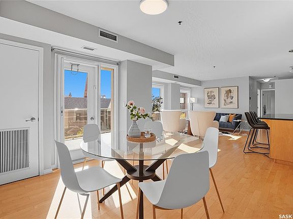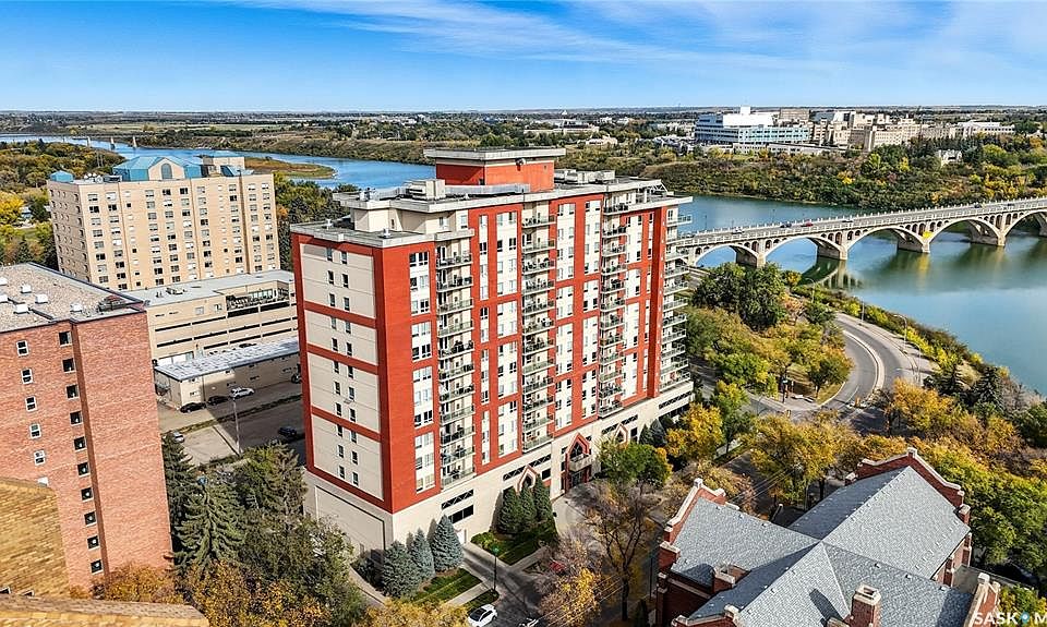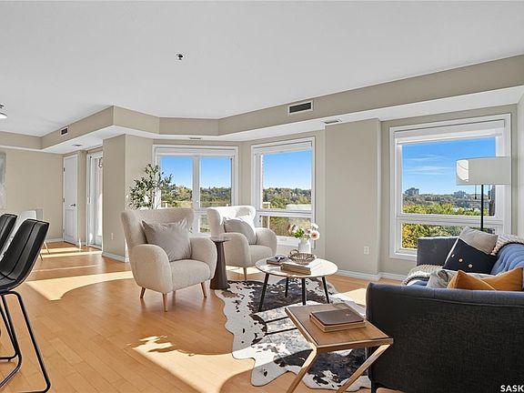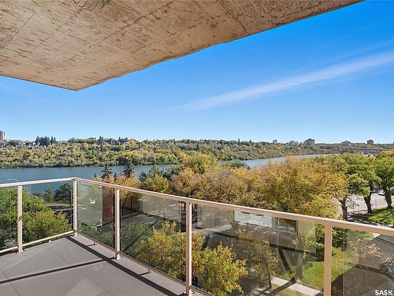 This beautifully maintained downtown condo offers one of the most desirable views in the building, overlooking the scenic river from its south-facing position. Perfectly situated to avoid harsh winds, it sits high enough to offer a stunning perspective above the treetops while remaining closely connected to the vibrant riverbank atmosphere. From your oversized balcony, enjoy a front-row seat to community events like runs, walk-a-thons, and fireworks, and soak in the sounds of live music during the Jazz Festival. Just under 1,200 square feet, the layout includes two spacious bedrooms and two full bathrooms. The bright, open-concept living space is ideal for both everyday comfort and entertaining, anchored by a large kitchen that features granite countertops, a tiled backsplash, and a massive island with additional seating. The adjoining dining area is bright and airy, while the expansive living room benefits from abundant natural light pouring in through the many windows. The generous primary bedroom includes a walk-in closet and a four-piece ensuite, while a second bedroom and additional four-piece bathroom provide ample space for guests or family. The laundry room adds convenience and the independent heating and central air personalized comfort year-round. Step outside your front door and onto the Meewasin River Trail, with direct access to walking and biking paths. Within walking distance of the University of Saskatchewan, Royal University Hospital, City Hospital, and Jim Pattison Children’s Hospital. Living downtown means you're surrounded by some of the city’s best restaurants, shops, entertainment, and cultural venues—all just steps away. One heated underground parking stall and a heated storage locker are included. Residents also enjoy access to a large amenities room complete with a kitchenette, pool table, lounge area, and a deck with BBQ. Exercise room is included in the condo fees, and for visiting friends or family, guest suites are available to rent.