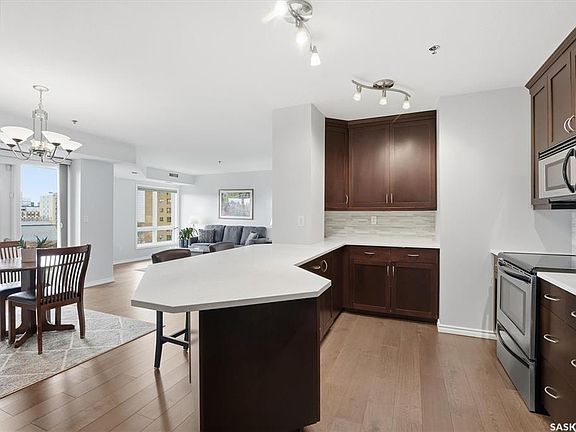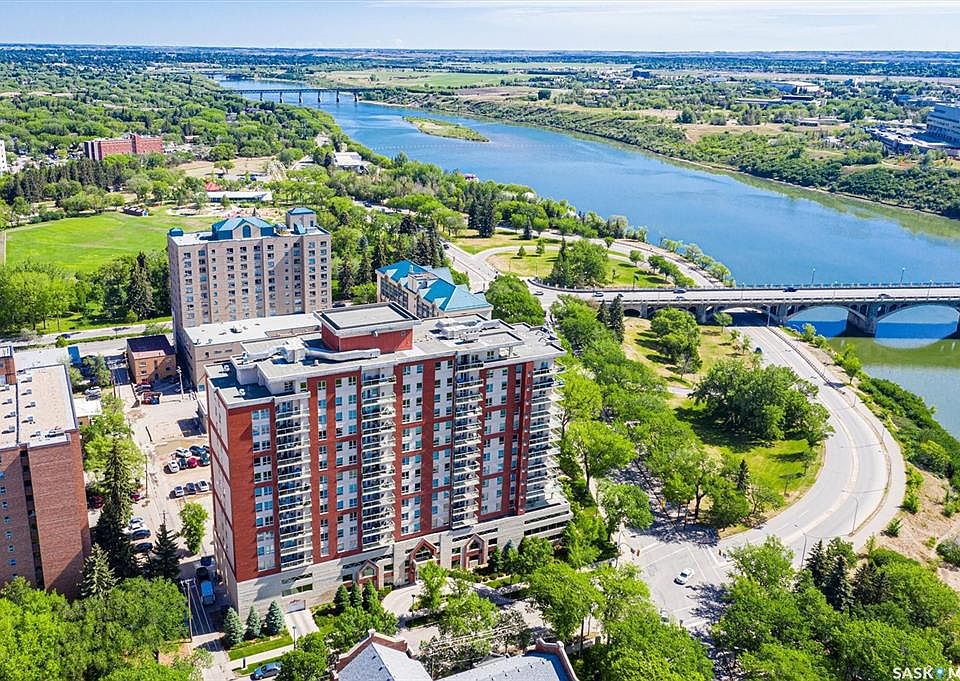 Experience riverfront living in this stunning southeast-facing LUX condo in the heart of downtown Saskatoon. Offering 1,155 sq ft, this 2-bedroom, 2-bath unit features an UPDATED bright, open floor plan designed to take full advantage of the natural light and breathtaking river views. The kitchen is beautifully finished with modern cabinetry, newer gleaming quartz countertops, and stainless steel appliances, opening to a spacious living and dining area with newer engineered hardwood flooring throughout. Two spacious bedrooms, 2 full baths, and a primary walk-in closet, plus an in-suite storage/laundry room, complete this lovely floor plan. Enjoy relaxing or entertaining on the private balcony with a natural gas BBQ hookup, overlooking the river, Bessborough, and Broadway Bridge. This unit includes 1 heated underground parking stall and a heated storage unit for added convenience. The building offers fantastic amenities, including a fitness room, a meeting room, and two guest suites. Ideally located along the Meewasin River Trail and park and steps from downtown restaurants, shops, and entertainment- the best of what our city offers!!
