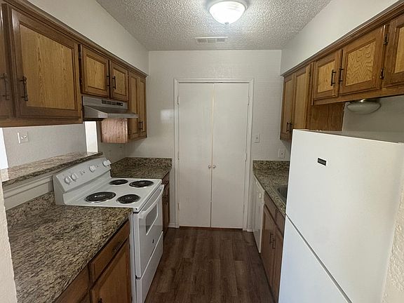 Ceiling fansCentral heat and airGranite countertopsVinyl flooringUpstairs unitBrown kitchen cabinets