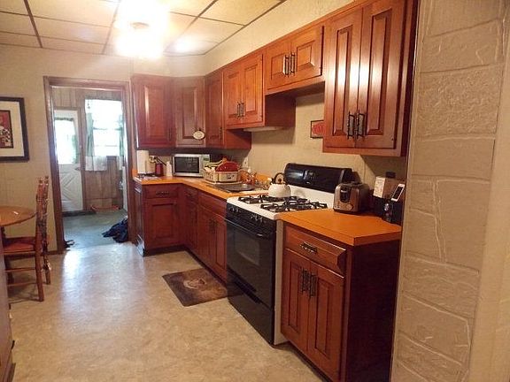 Eat in kitchen with quality cherry maple cabinets and built in bookcase. The laundry room is right off of the kitchen with easy access to the fenced in yard for your convenience. Second floor bath has been redone with new cabinets and ceramic tile floor. This home also has affordable GAS HEAT.